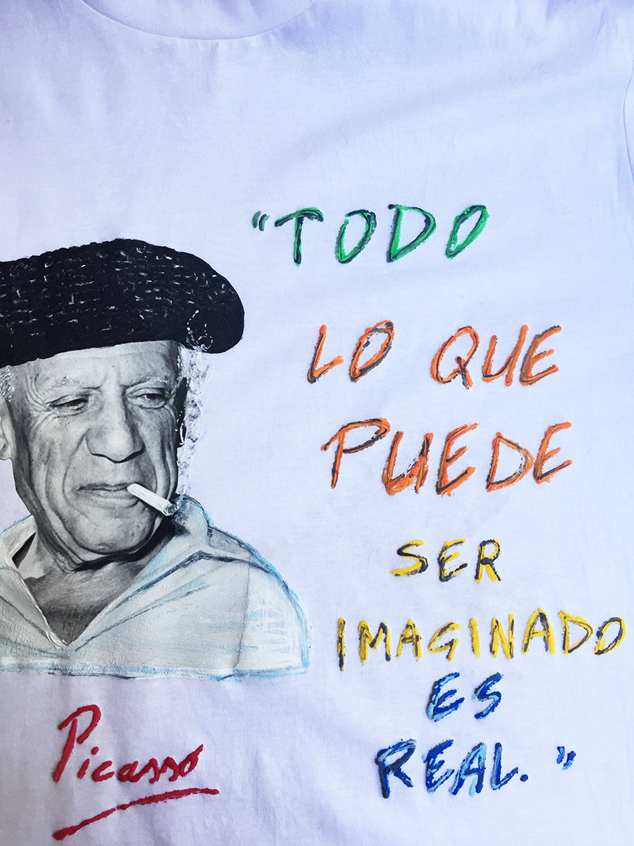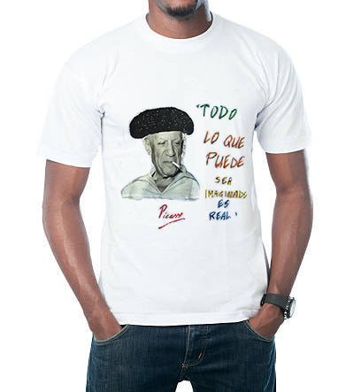 If you decide to order one of my PABLO PICASSO T shirts, I will hand print and paint for YOU, on YOUR unique T-shirt, with my unique technique, using Permanent colors on relief, this Picasso's portrait and one of his motivational quotes, the following one: