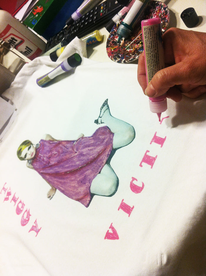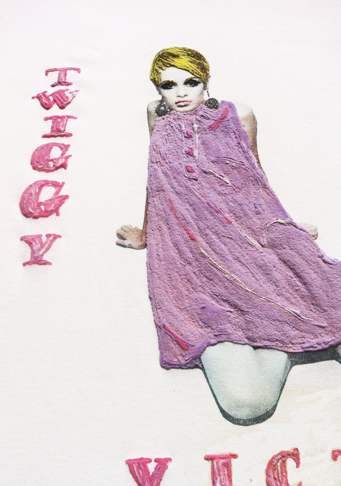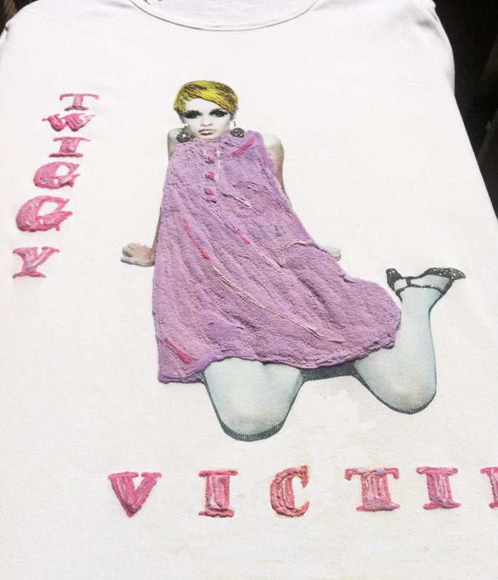 My Twiggy artistic t shirts, the most popular top model of 60s, is handprinted and painting by me to celebrate the most populare mannequine of 60s.
