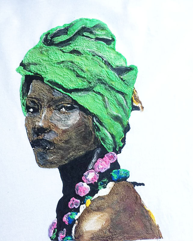 I will paint for YOU YOUR unique T-shirt, this wonderful Black Queen with Green head wrap