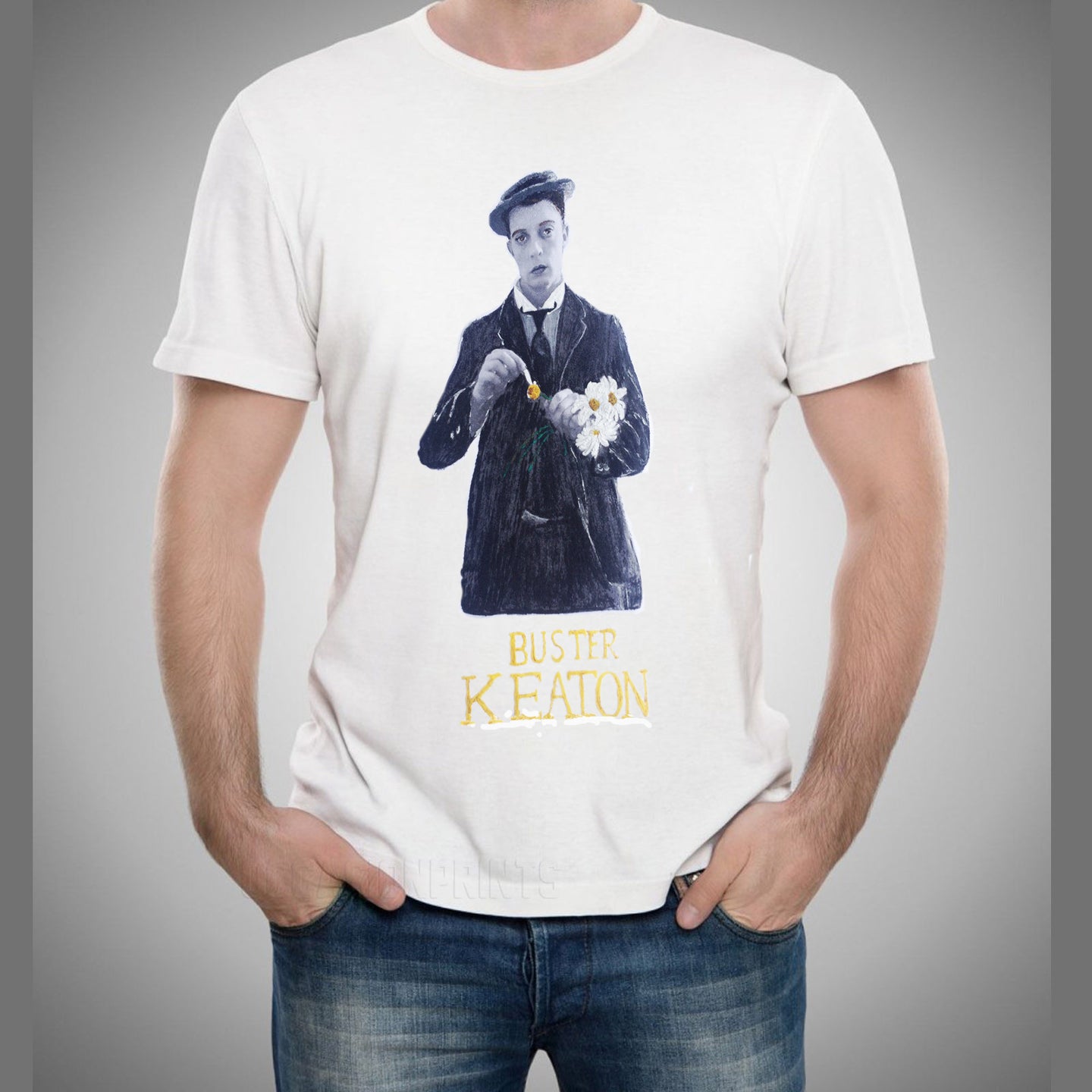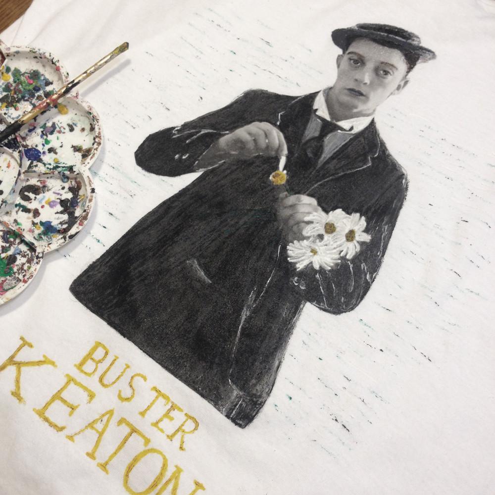 I will create On Your Demand with my Permanent Colors On relief this Buster Keaton's tshirt, hand printing and painting this amazing image.