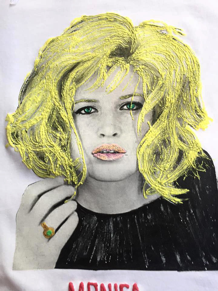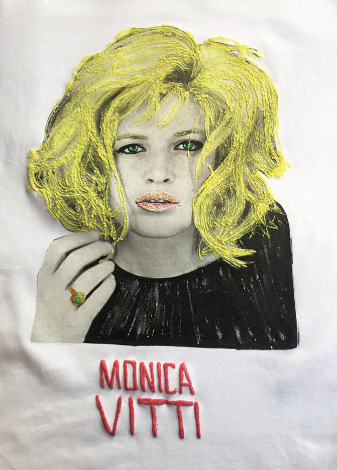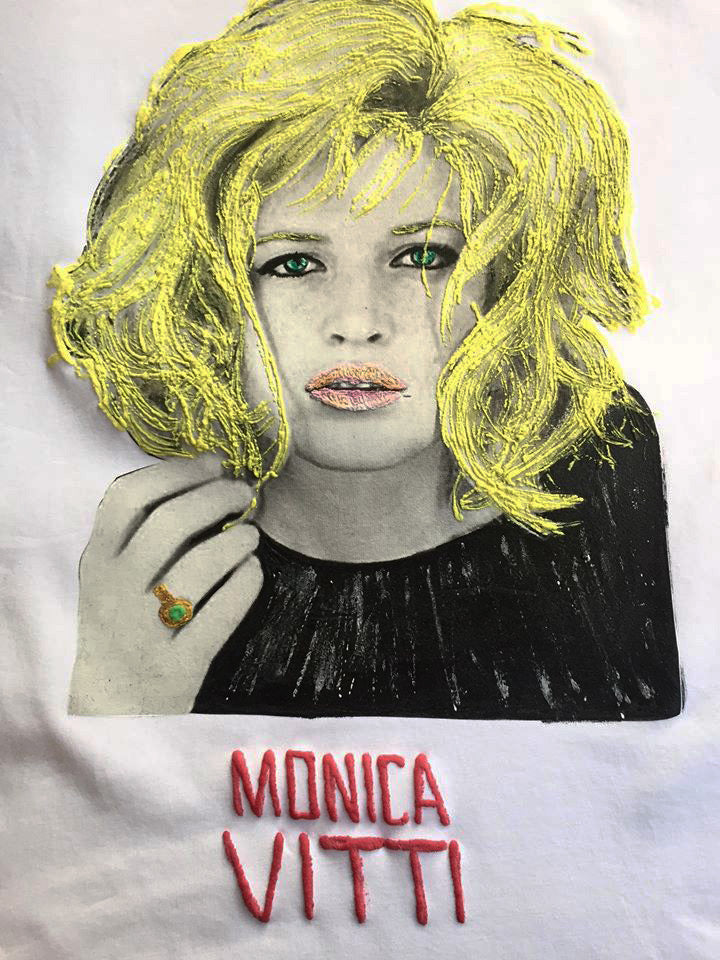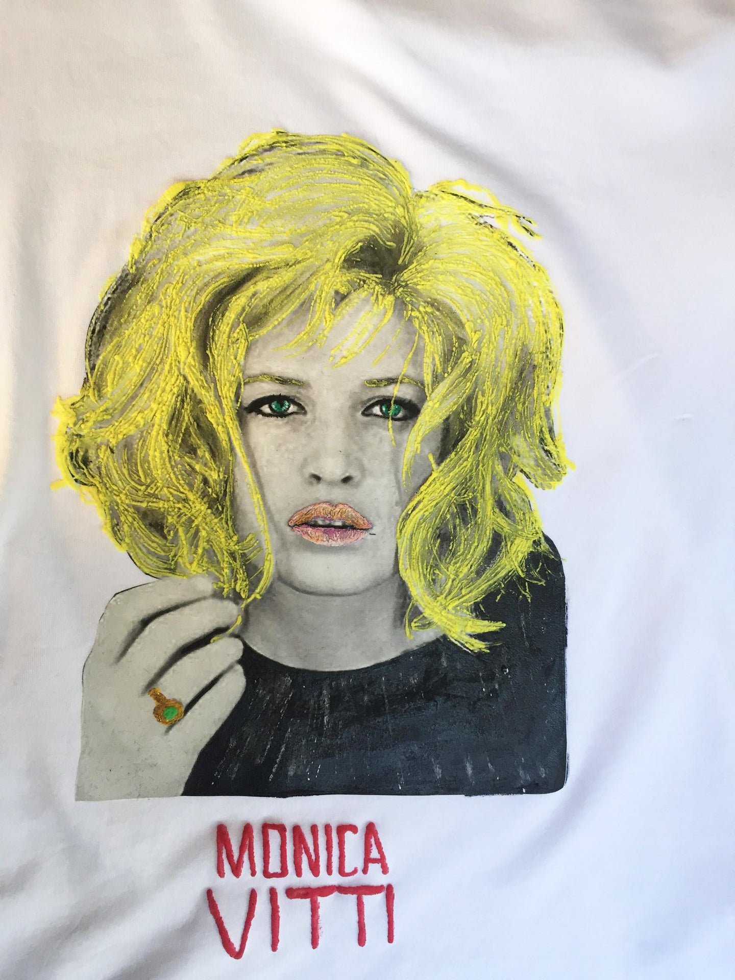 So I decided to realize my personal tribute to Monica Vitti, hand printing and painting by me a T-shirt, using permanent colors on relief , with my personal technique