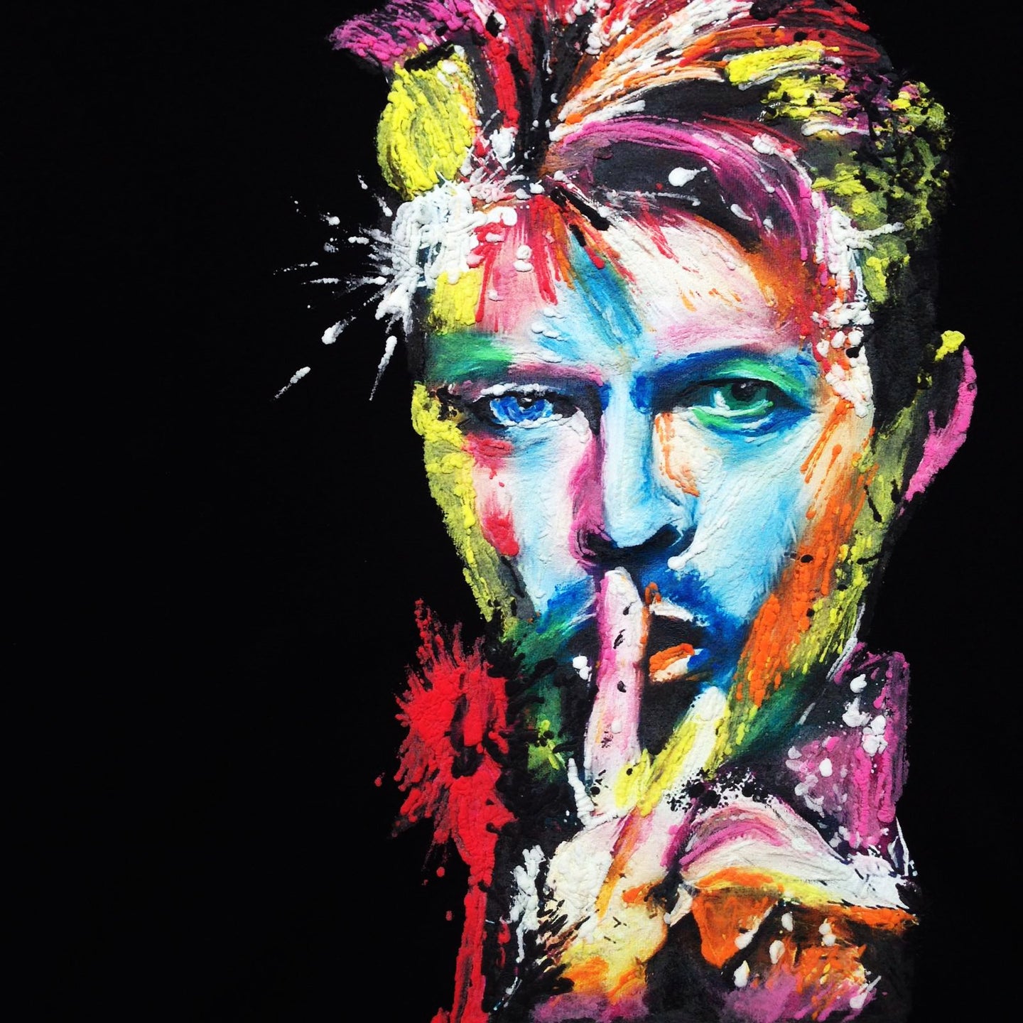Zoomed-in view of hand-painted Bowie portrait on black T-shirt – bold strokes and striking color contrast