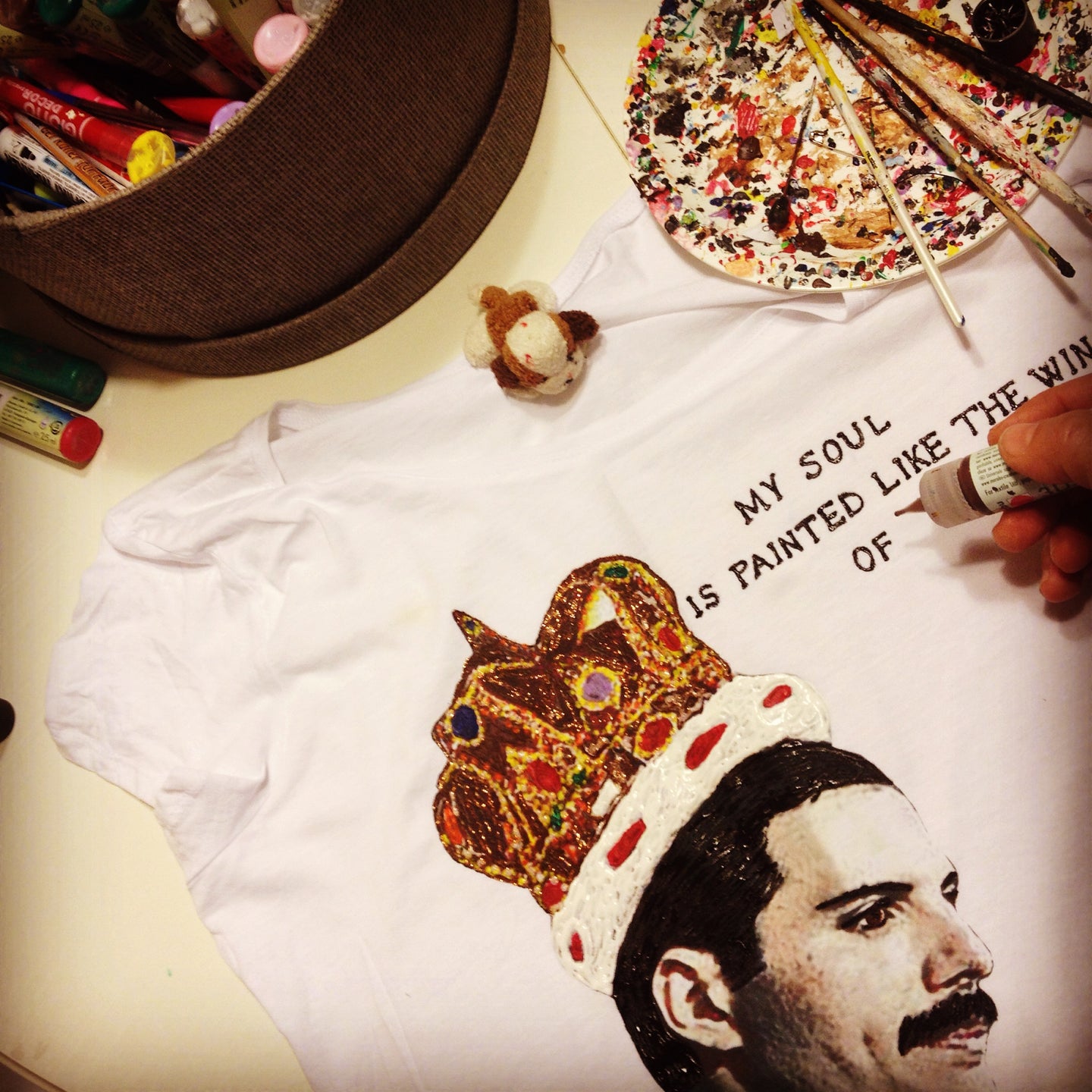 I will hand print and paint by me, with my unique technique, using Permanent Color on relief  this Artistic T-shirtwith a fabulous Freddie Mercury  image and his caraterizing phrase,