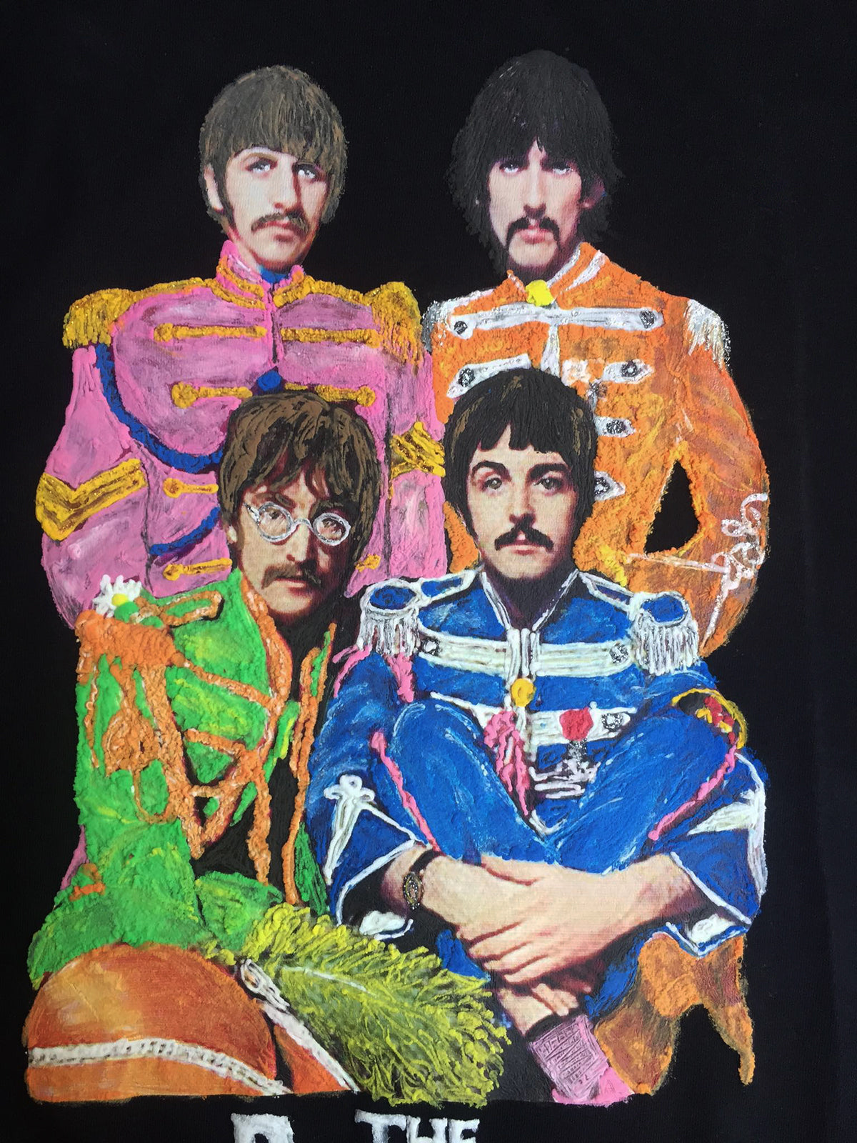 🎺✨ Step into a pop culture masterpiece with this hand-painted Quortshirt inspired by The Beatles’ Sgt. Pepper’s Lonely Hearts Club Band.