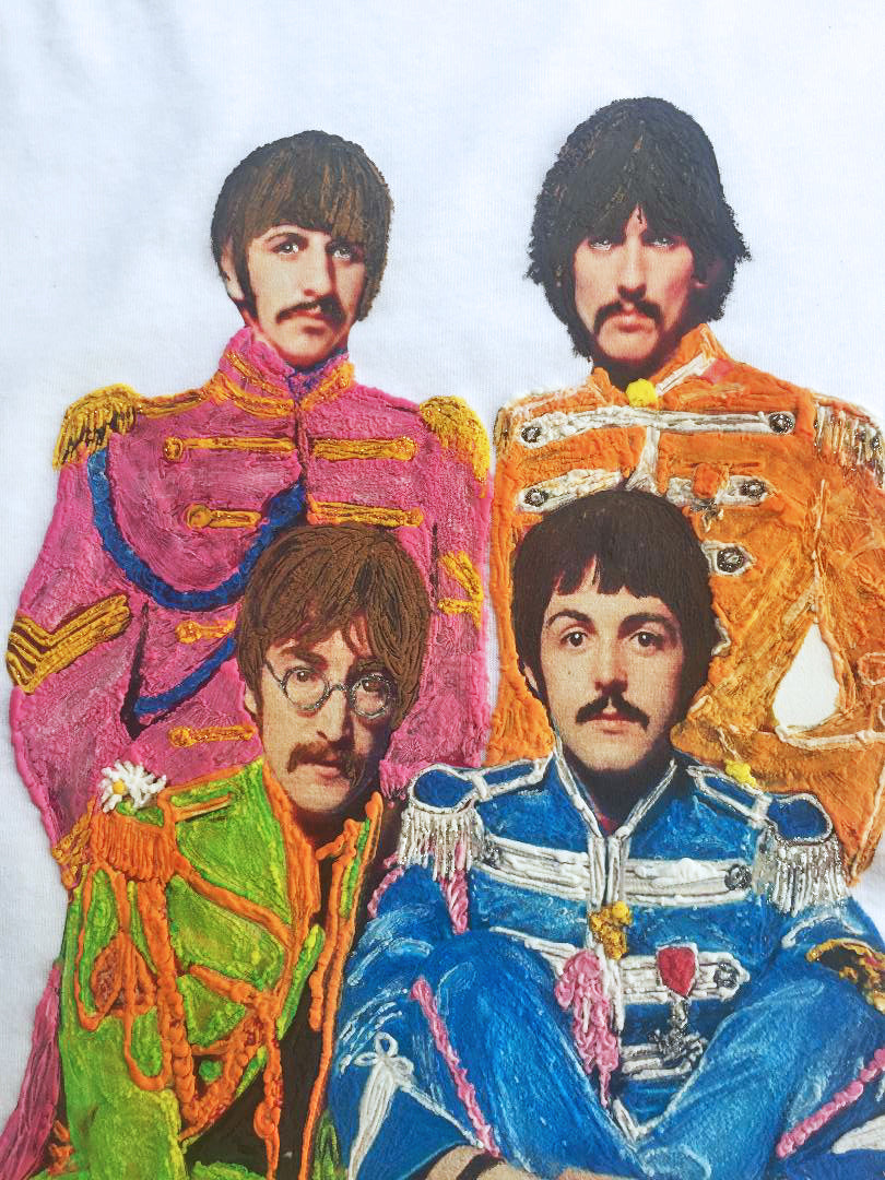 Hand-Painted Sgt. Pepper Beatles T-Shirt – Full-Body Portrait in Iconic Outfits
