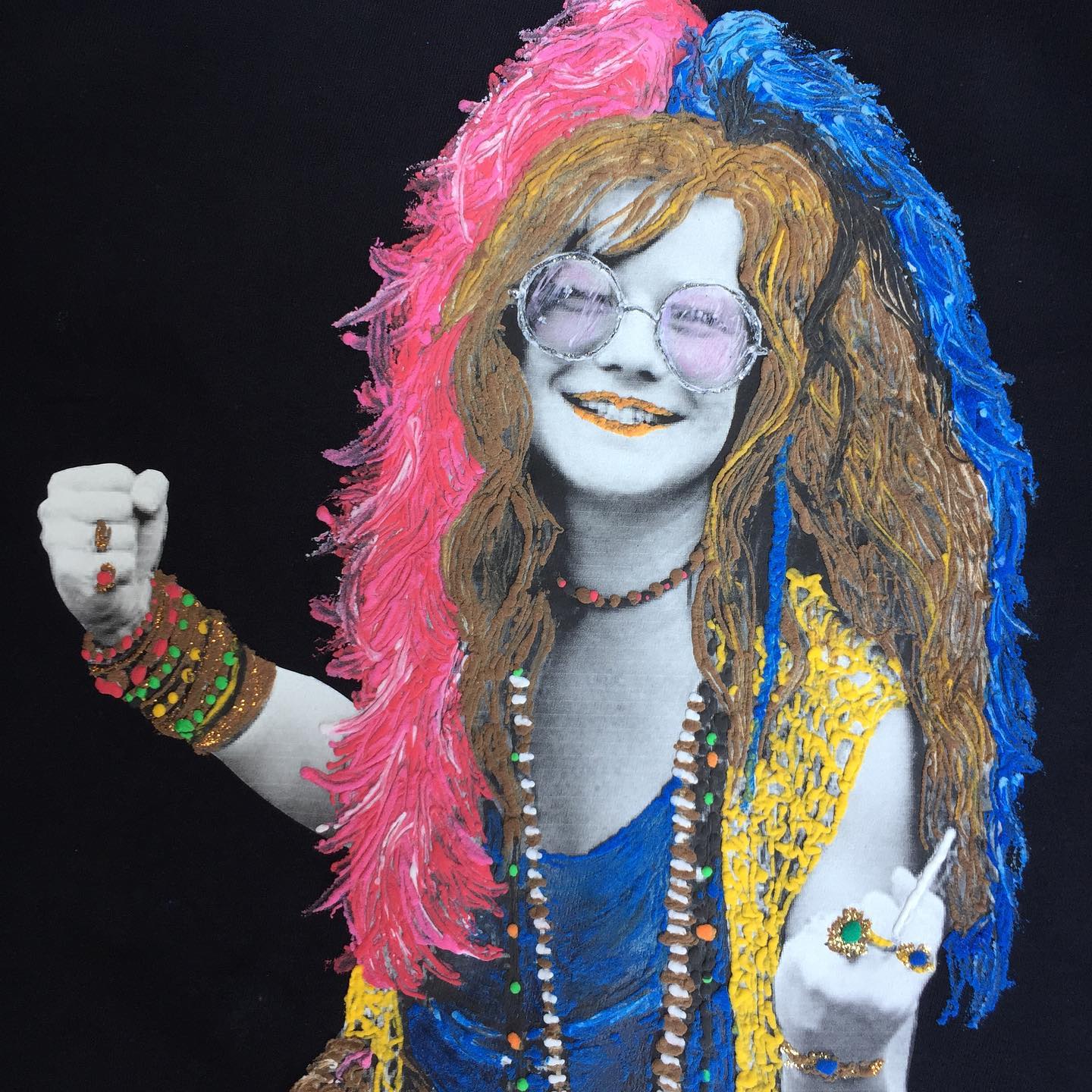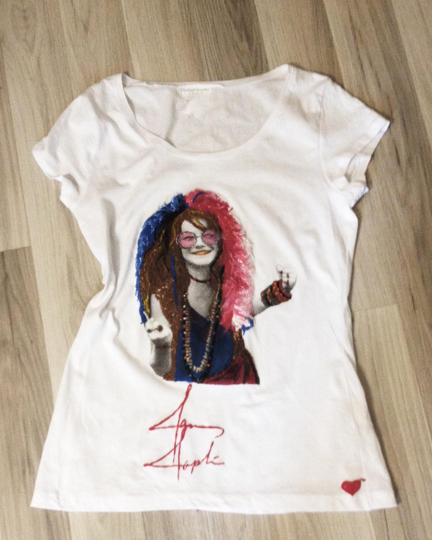 This J. Joplin's Artistic T-shirt hand printed by me and painted (also by me) with my special and original technique in 3d , is my tribute to her uninhibited singing style that, combined with her turbulent and emotional lifestyle, made Janis Joplin one of the biggest female stars in her lifetime