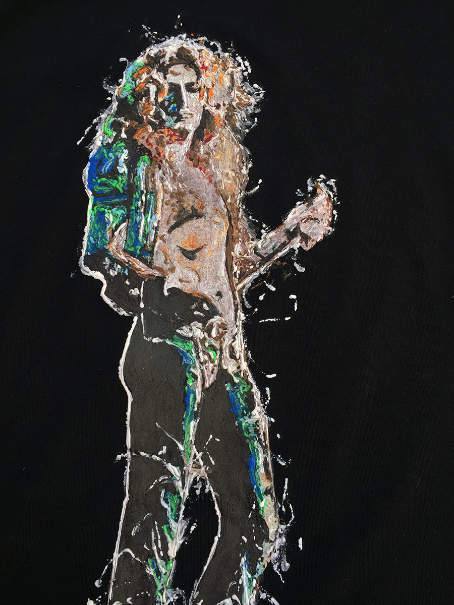 Step into the golden age of rock with this hand-painted Quortshirt, inspired by a young Robert Plant in full iconic glory.