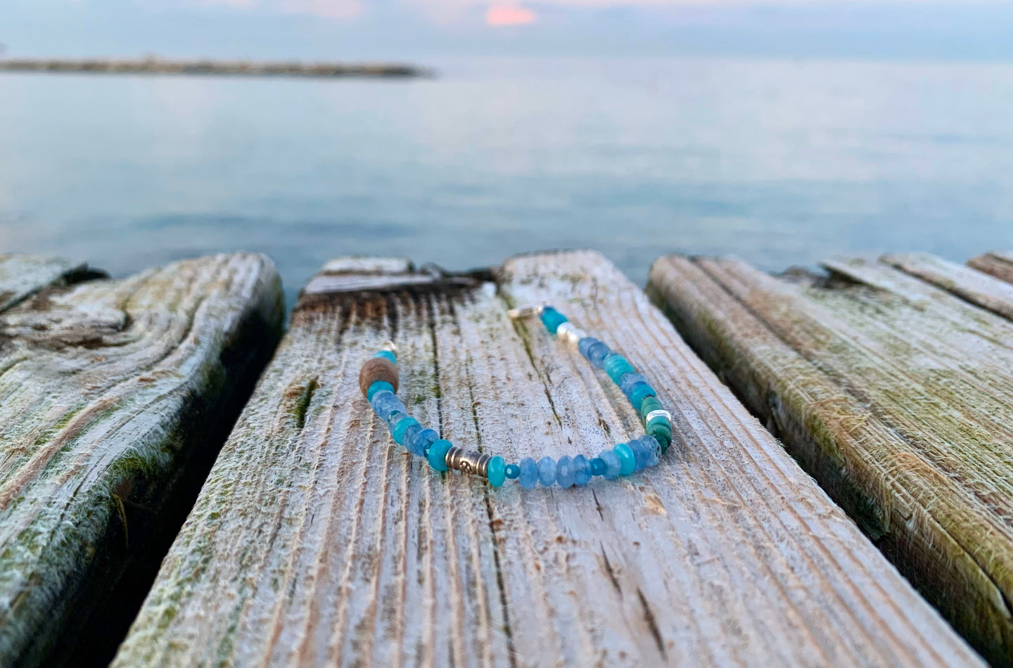 Each gemstone in this bracelet has been thoughtfully selected to create a powerful synergy. The calming energies of celestial agate and jade are perfectly balanced by the transformative properties of African turquoise and blue apatite. The freshwater pearls and wood coral add a touch of tranquility and grounding, while the Karen Hill Tribe silver spacers and clasp provide a sophisticated finish.