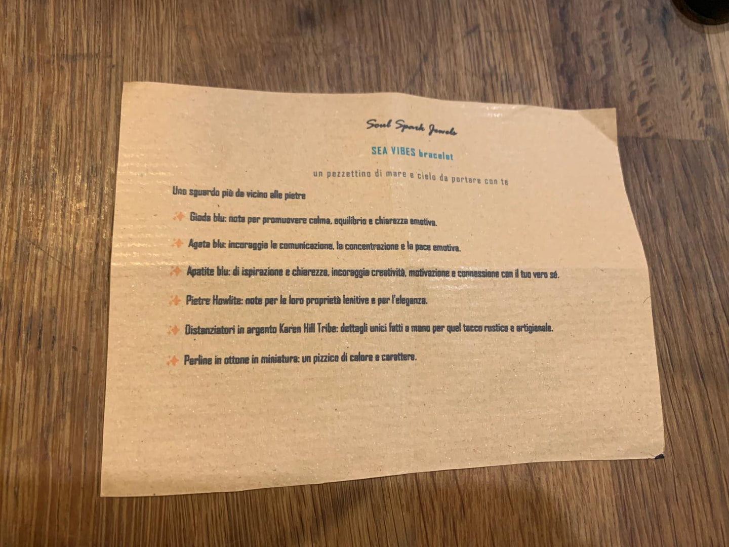 ** The bracelet arrives in a gift bag accompanied by a card listing all the stones that compose it and a description of their energetic properties.
