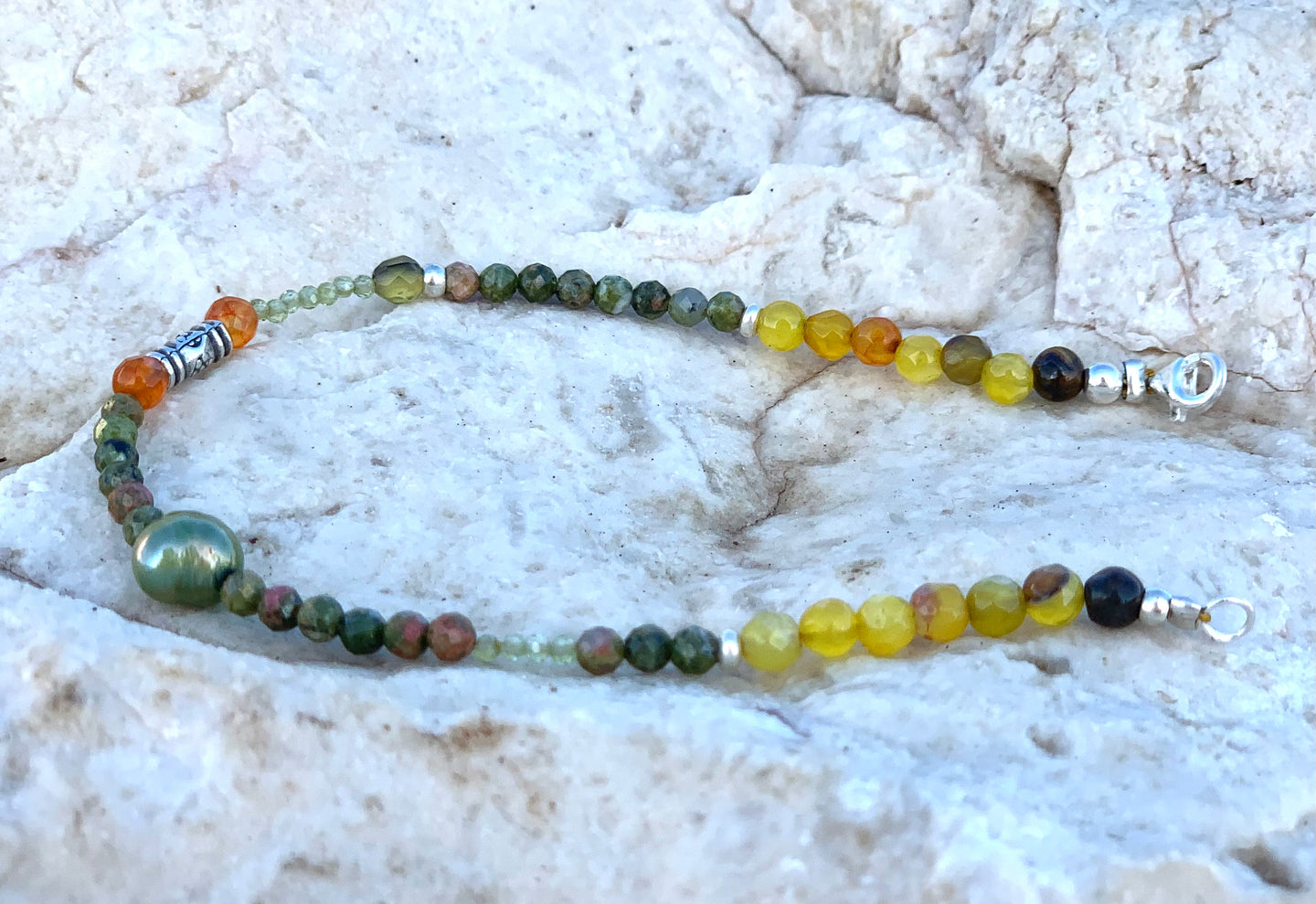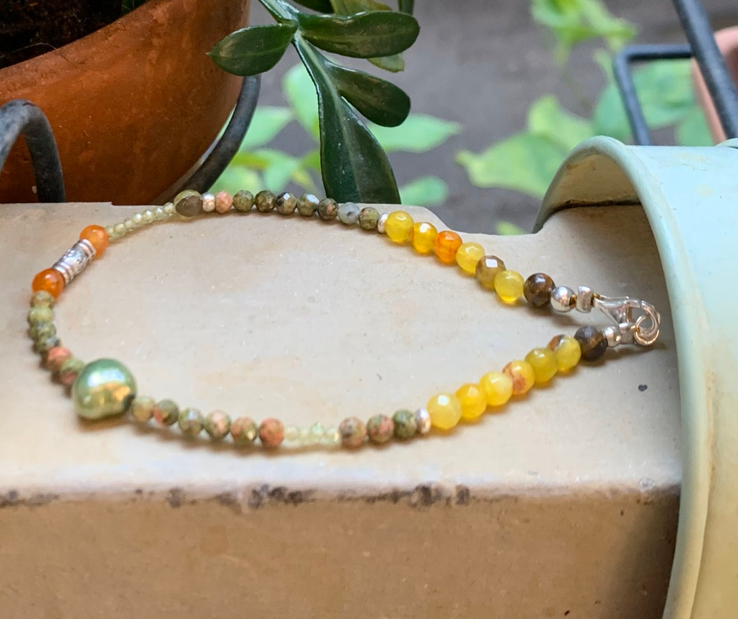 Harmony and Energy Bracelet Green Yellow & Orange Faceted Agates, Unakite, Green Aventurines, Baroque Pearl, 925 Sterling Silver